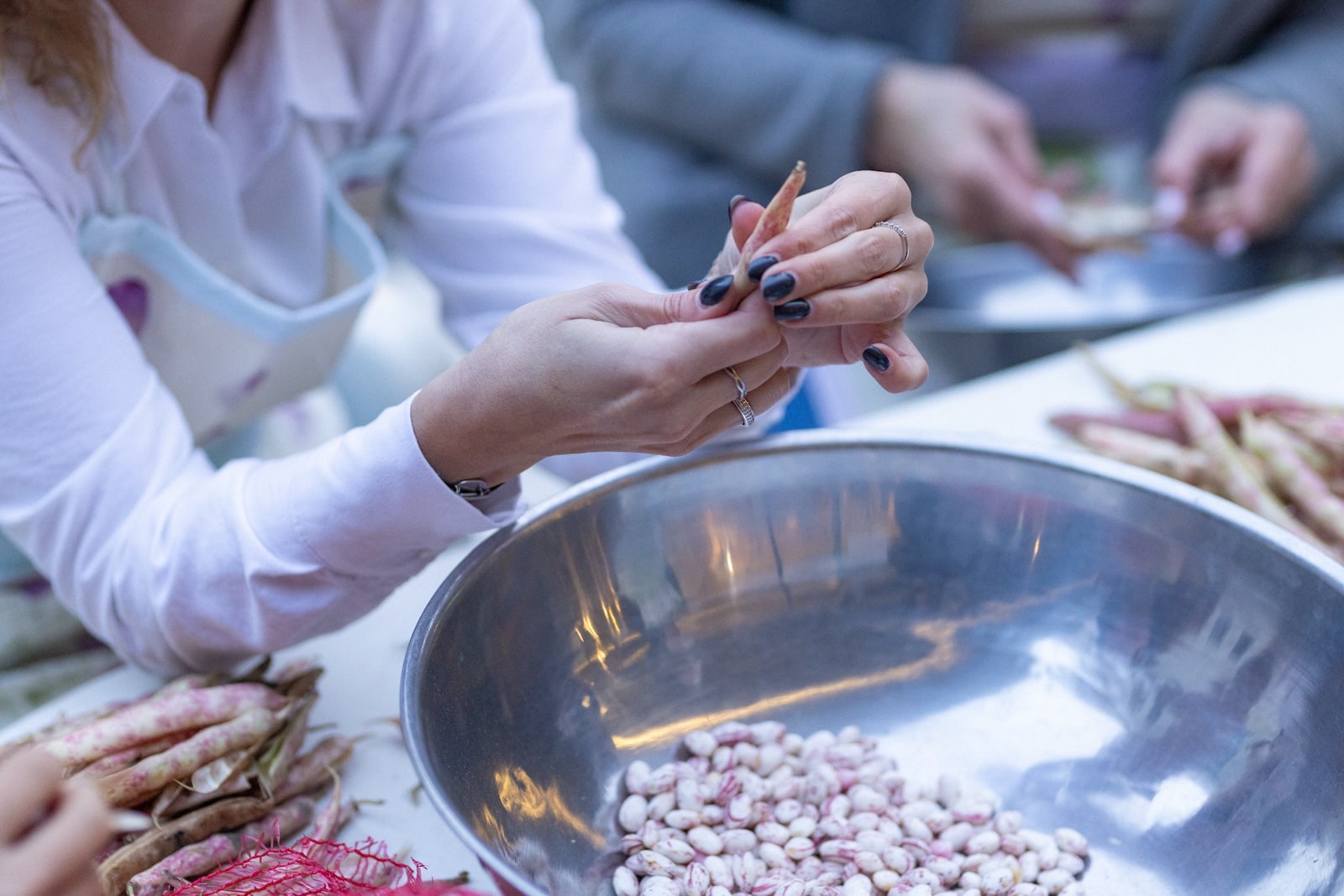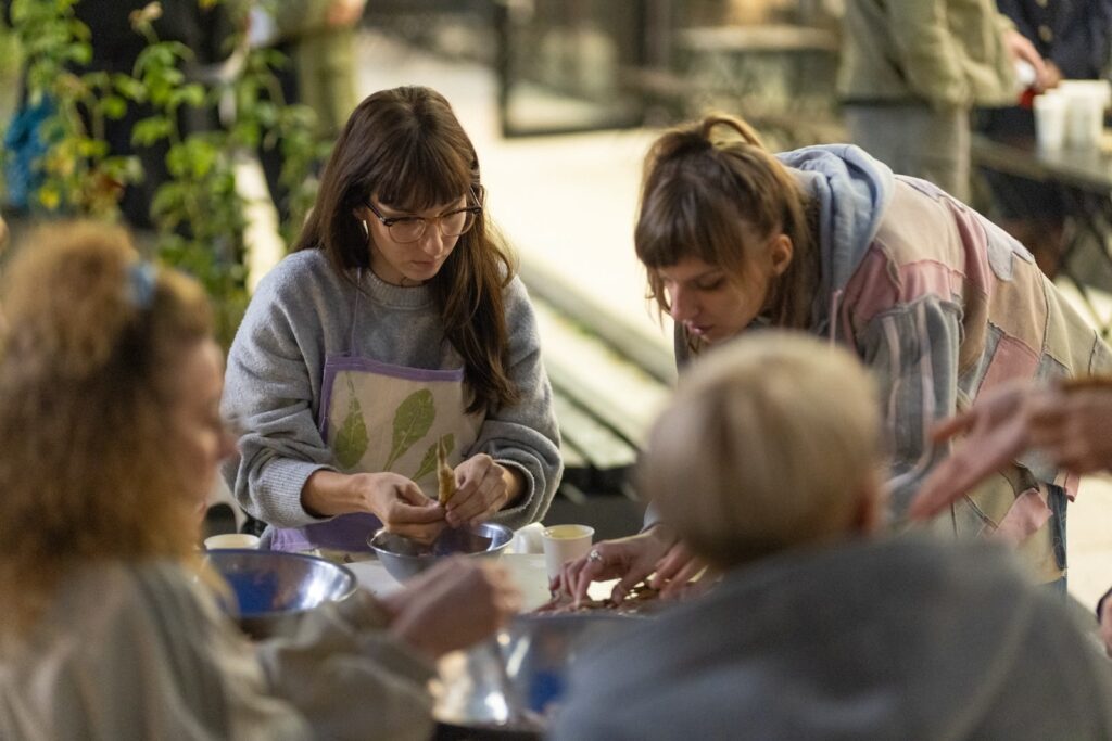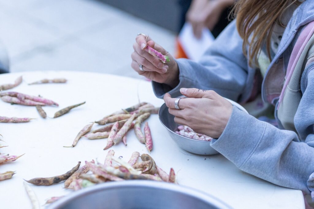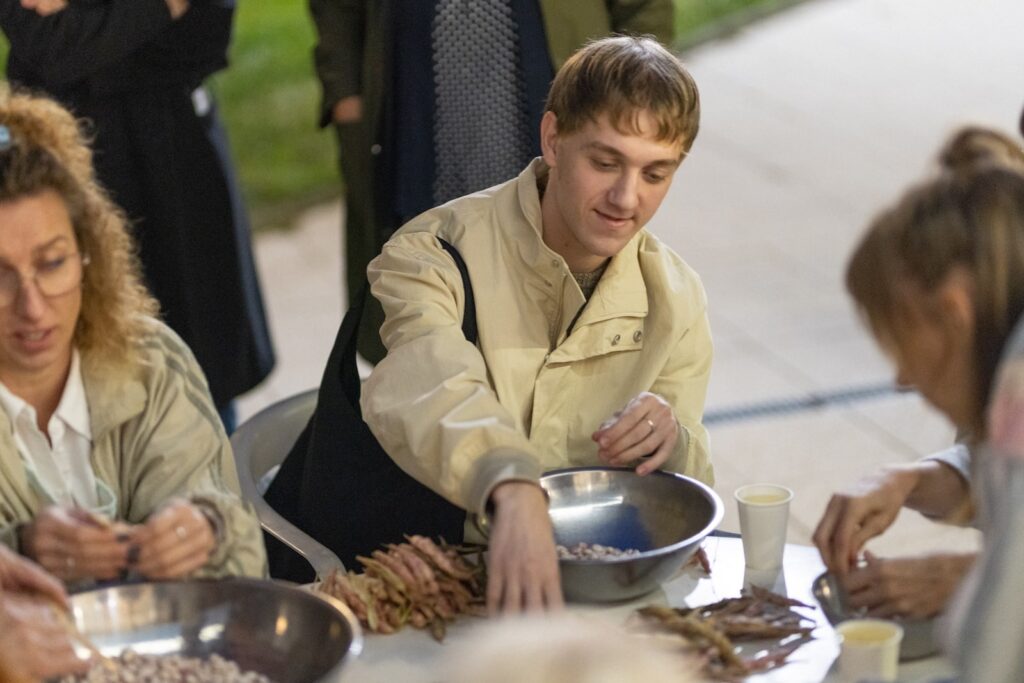 Happening guljenja mahunarki u kojemu sudjeluju umjetnica, njezina sestrična, majka i teta, a koji je otvoren publici da se pridruži, postav je rituala okupljanja, povezivanja radom, dubokog fokusa, opuštanja i neobaveznog dijeljenja. Kako sama napominje, prva asocijacija na guljenje mahunarki nije rad nego dijeljenja, možda upravo zato što se odvija oko stola, tog posvećenog mjesta ukojemu profano dobiva note posvećenog. Nedostaju nam rituali i vrijeme koje podnosi prazninu i neobavezujuće provedeno vrijeme.