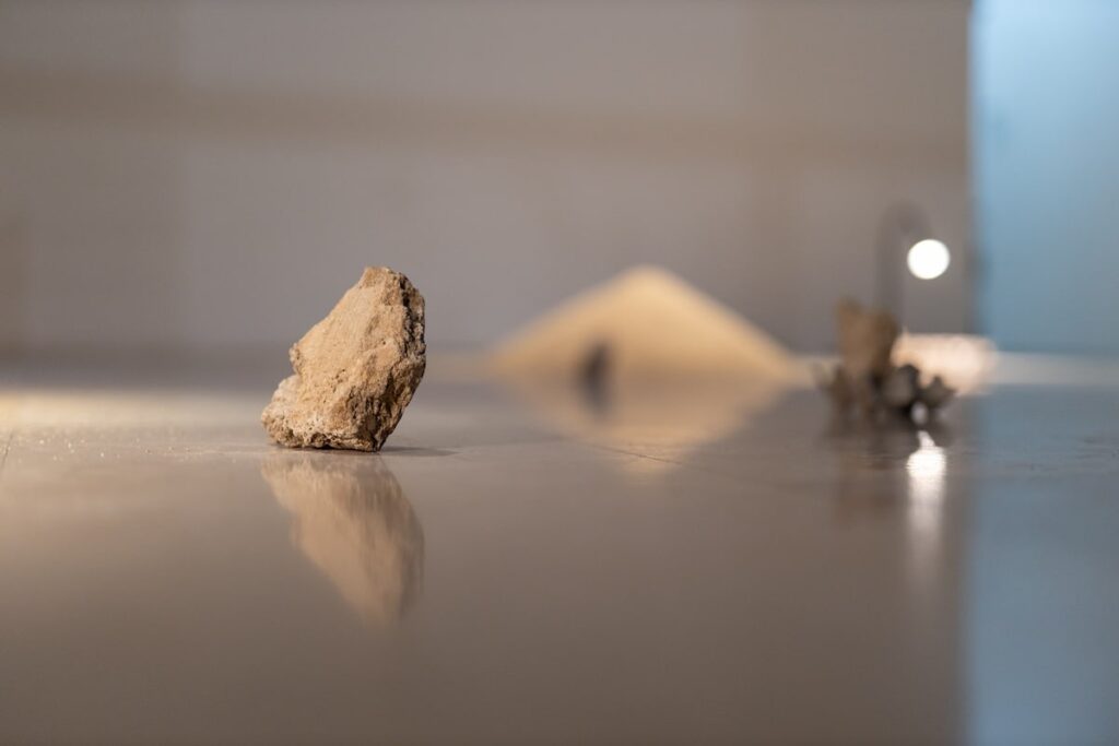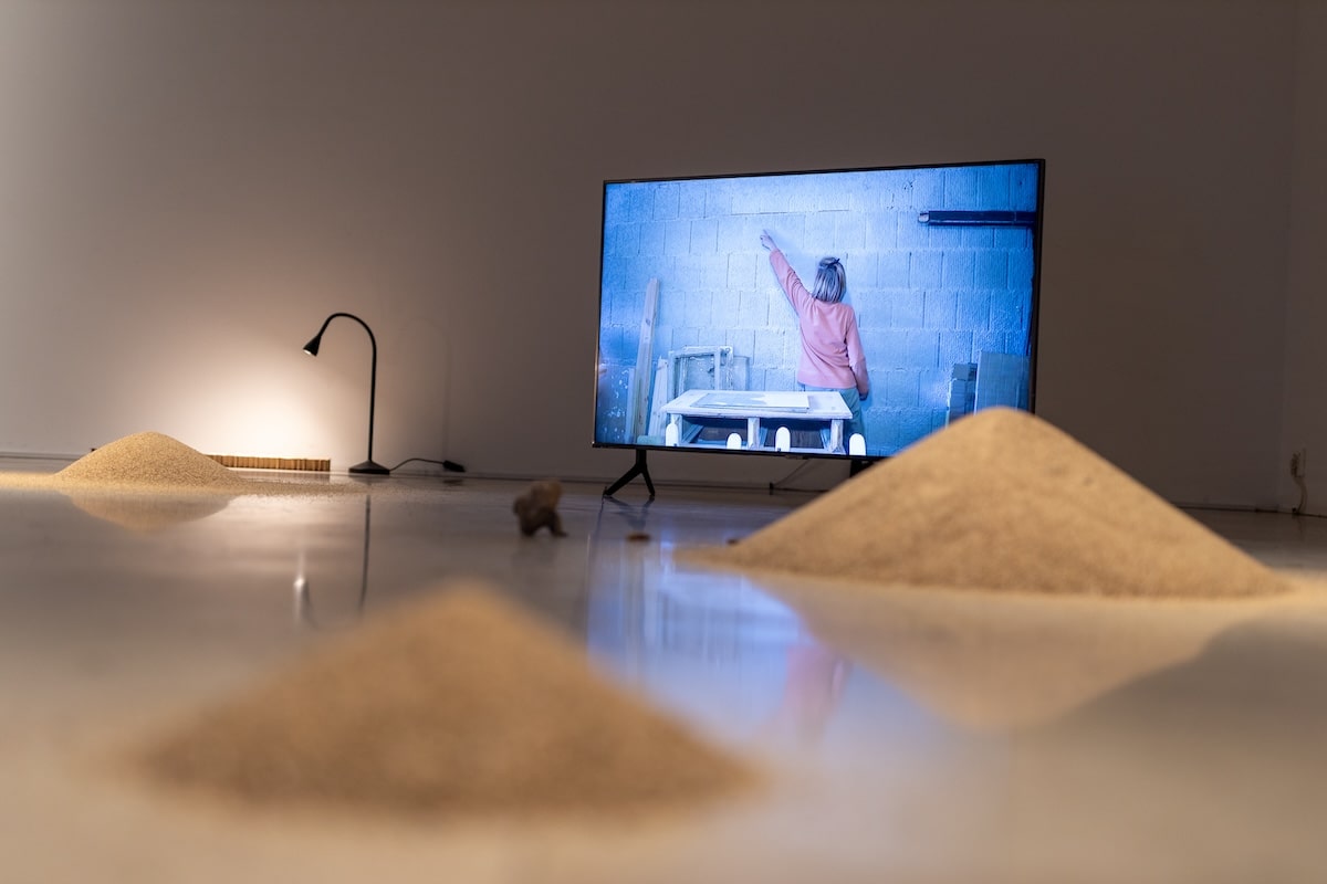 Donoseći aktivaciju podražaja (vizualnih, auditivnih, taktilnih) uz naglašenu autorefleksivnu crtu i etnografski pristup, Lucija pruža slojevitu priču o odnosu ljudi i njihova neposrednog prostora – kako u fizičkom, tako i u simboličkom smislu. Uz to otvara pitanja transformacije prostora tijekom vremena uslijed promijenjenog društvenog konteksta te njezinih posljedica. Kroz „pogled odozgo“ pristupamo i otkrivamo slojeve rada. Polazeći od materijala donesenih s Vrbnika u vidu kamenih krhotina zidova i malih kupova morskog pijeska prosijanog na različitu finoću, koji se koristio kao jedan od gradivnih elemenata, nudi nam jedan od pogleda na prostor, njegov put od zemljišta i terena prema resursu. Razmišljanje o prostoru kao resursu, koji sam po sebi označava potencijal za iskorištavanje, ponajbolje se može doživjeti kroz video u kojem se objašnjava planiranje fleksibilnog skeleta unutarnjeg prostora, a koji se pak može prekrojiti prema daljnjim ljudskim potrebama. Kada zemljište postane resurs, ono postaje nešto čime možemo ovladati, opisivati njegove atribute i učiniti ga privlačnim (za nekoga). Kroz zvučnu podlogu, koja predstavlja kontekstualizaciju cijelog rada, Lucija nam objašnjava način konstrukcije prostora i njegove manifestacije kroz jezik, dok simultano možemo vidjeti prikaze karte i pomicanje ruke umjetnice u „koreografiji stvaranja znanja“ u (o) prostoru.