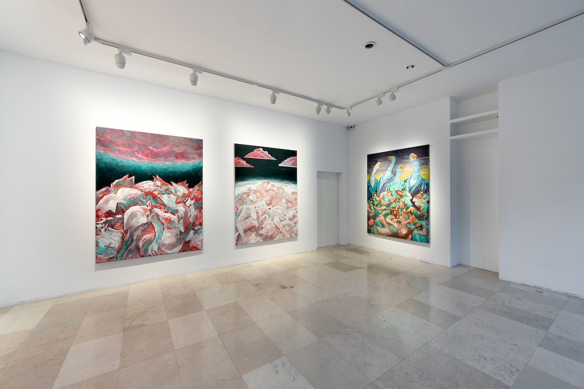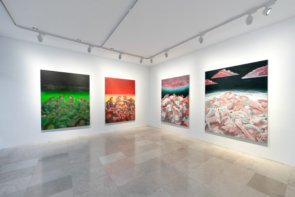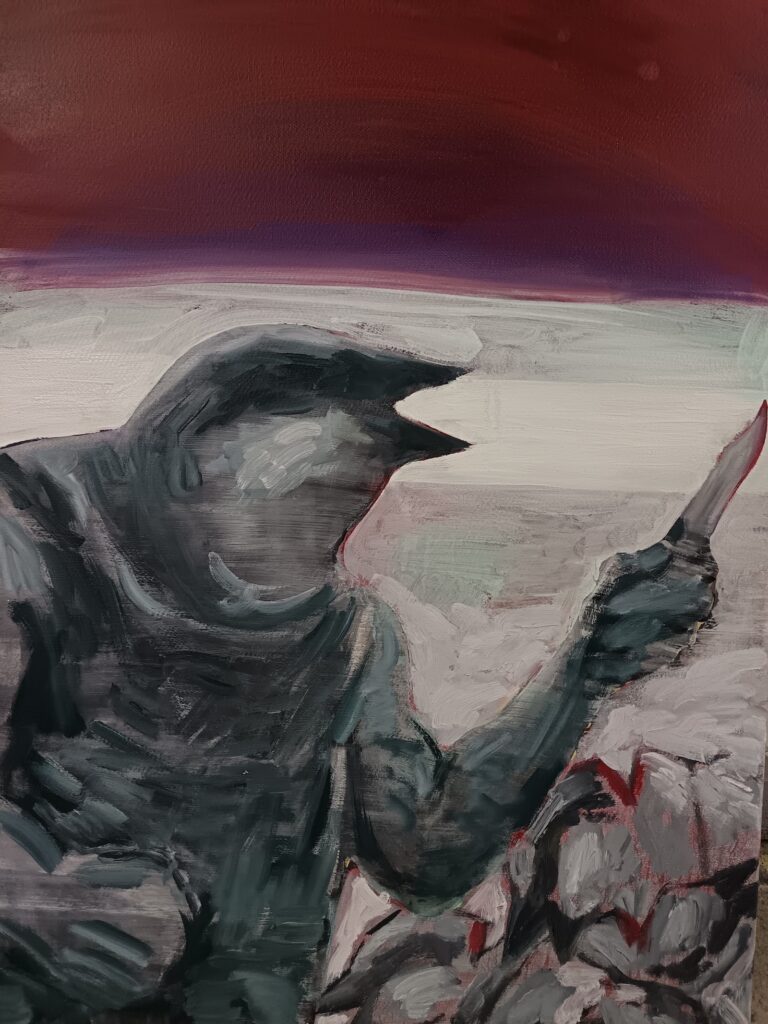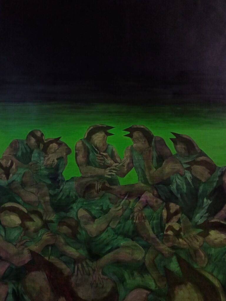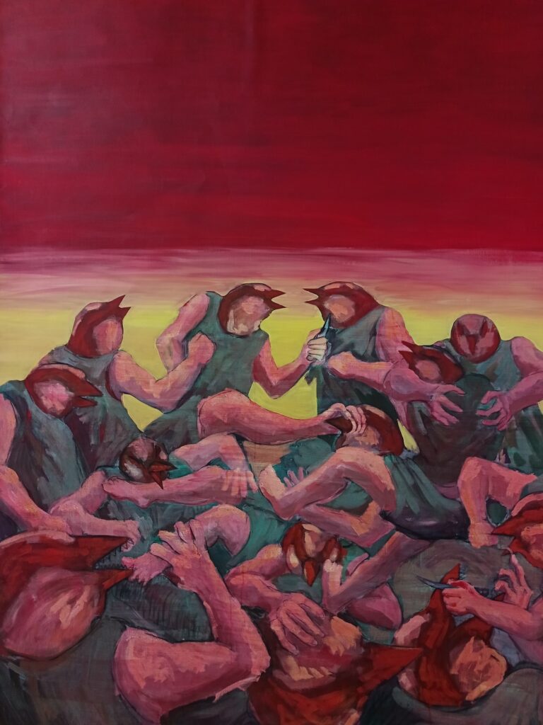 Evoking expressionist painting, both in its formal characteristics and in its socially directed critical thought, the author presents an apprehensive and chaotic vision of the flow of beings in society. Like figures emerging from nowhere, surreal and frightening characters appear to us, provoking the viewer and prompting them to ask in which temporal dimension they have found themselves; in the distant past, a simulation of the present, or a potential future. The main motif in the works consists of depictions of people with different bird heads, and the distinction between the two opposing currents the author wants to convey is clearly separated compositionally. In the foreground, there is a group with sparrow heads—ordinary people, the masses—while the background features a smaller group with goose heads, symbolizing those in power, the ones in whose hands power lies. Those in power only appear in the initial moment, disappearing from the other works, embodying their agenda in a grotesque portrayal of aggression and violence that flares up between ordinary people. In building the narrative of the cycle “Some Birds Never Fly,” color plays an important role; both through the choice of individual colors and tonal modulation, a gradual intensification of tension is achieved until its climax and a return to the initial state, thus presenting the viewer with a circulus vitiosus. The author aims to convey how power and control over individuals appear in their subtle, insidious form. Physical and direct forms of coercion are nonexistent here; instead, it unfolds through various strategies of manipulation, guided by the principle of dividing individuals in society to more easily manage and divert them, drawing attention away from the real object of focus. This is a strong message about a society in which a corrupt way of functioning has spread through its very pores; can such a society progress, and for whose benefit, or will it ever (and when) take wing?