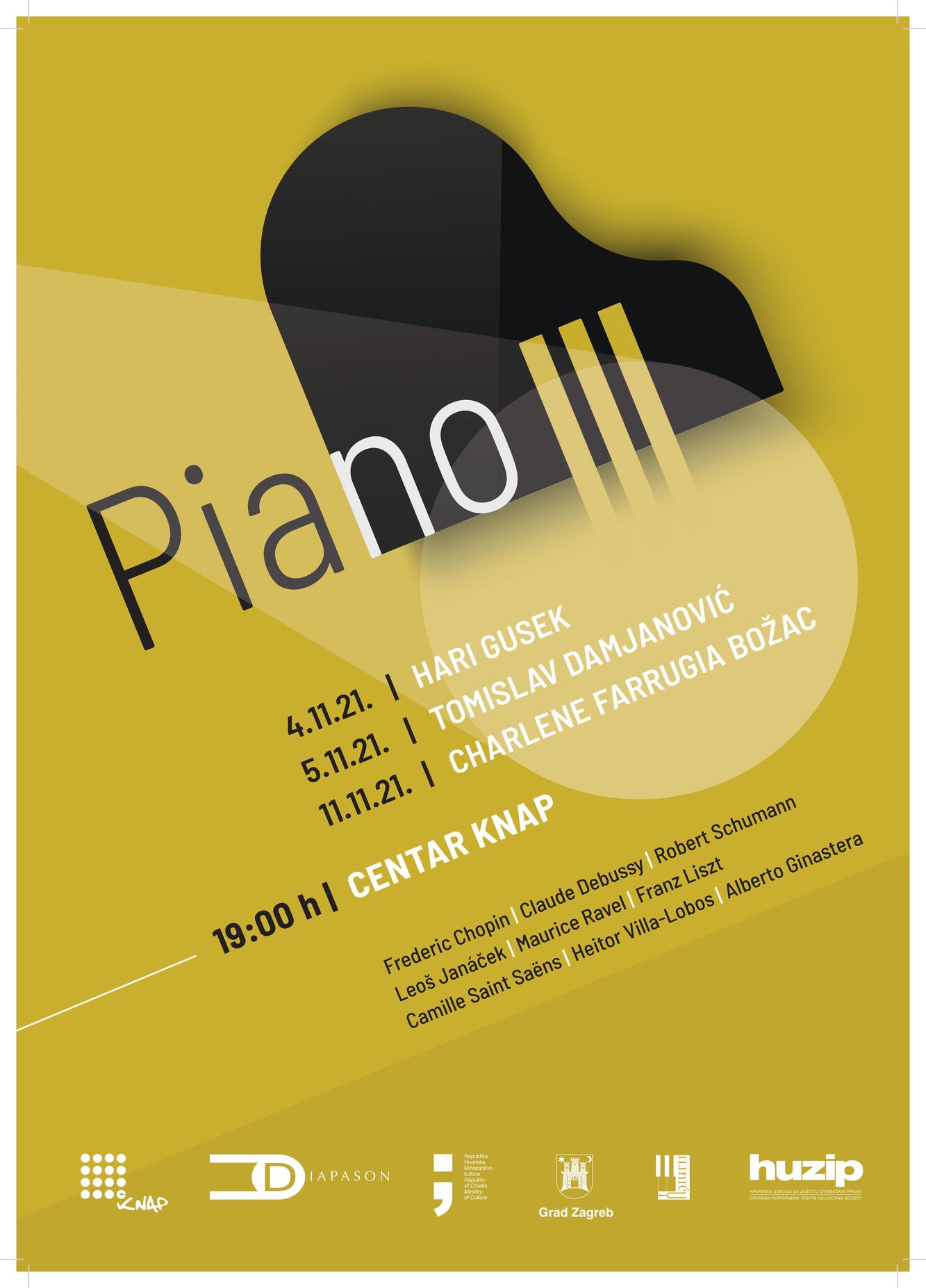 Od 4. do 11. studenog u Centru Knap održat će se drugo izdanje glazbenog festivala Piano3. Istaknuti hrvatski pijanist i glazbeni pedagog Srđan Čaldarović osnovao je festival zamislivši ga kao platformu za prezentaciju, promociju i njegovanje pijanističke glazbene umjetnosti, posvećenu hrvatskim pijanističkim virtuozima.