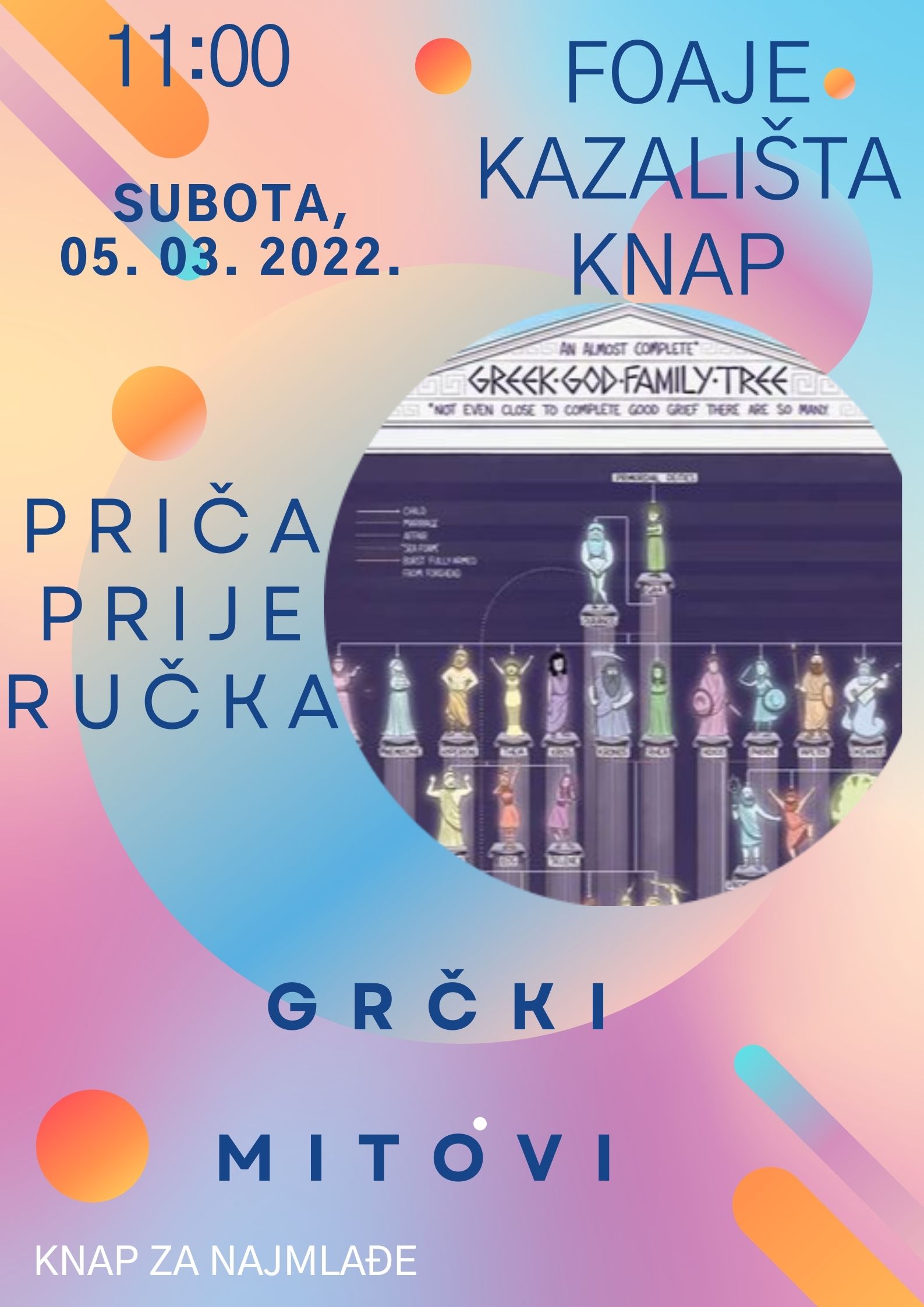 kako nam se približavaju topliji dani i mi ćemo počete pričati i priče o toplijim krajevima. Zato vam predlažemo da nam se u subotu, 05. ožujka pridružite na našoj Priči prije ručka kada ćemo pričati drevne grčke mitove. Tom prilikom ćemo saznati nešto više o životu drevnih Grka, tko su i kavi su bili ti njihovi bogovi i kakve su sve bile njihove čarobne priče, a nakon toga izradit ćemo umjetničke predmete u antičkom stilu. Dok se mi divno zabavljamo, roditelji mogu popiti svoju subotnju jutarnju kavu u našem kafiću. Čekamo vas u foajeu Kazališta KNAP točno u 11 sati. Vidimo se!