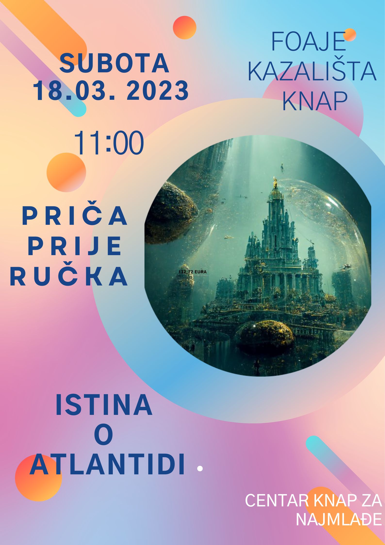 u subotu, 18. ožujka očekuje nas jedna potpuno luda tema na našoj Priči prije ručka. Naime, saznat ćemo nešto više o tajnama drevne civilizacije Atalantiđana. Premda je Atlantida do sada samo mit, mi ćemo pokušati dočarati kako je izgledala njihova civilizacija, kako su živjeli i zašto su na kraju propali. S obzirom na to da su Atlantiđani radili puno s kristalima, u likovnom dijelu očekuje nas izrada lažnih kristala. Bit će nam ludo, bit će nam zabavno, a kao i uvijek otkrit ćemo svašta. Čekom vas u Foajeu Kazališta Knap u 11 sati. Veselimo se.