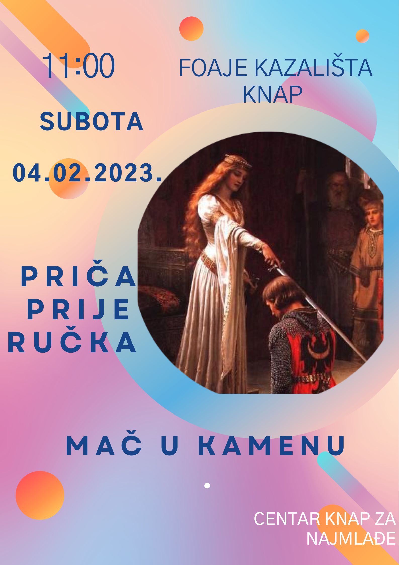 kako bismo što prije potjerali ovu sad već pomalo zamornu zimu, predlažemo vam da nam se u subotu, 04. veljače pridružite na našoj Priči prije ručka. Tada ćemo u našem vremeplovu otploviti u drevnu Englesku, te osim što ćemo saznati kako je izgledao život srednjovjekovnih vitezova i njihovih dama, ispričat ćemo čuvenu priču o famoznom kralju Arturu i njegovom maču u kamenu. Kasnije ćemo izraditi potrebne stvari kako bismo se pretvorili u vitezove i njihove dame ili čarobnjake i vještice, a nakon toga… tko zna, možda i sami izvadimo neki čarobni mač iz kamena. Očekujemo vas u 11 sati u foajeu Kazališta Knap. Strašno se veselimo !