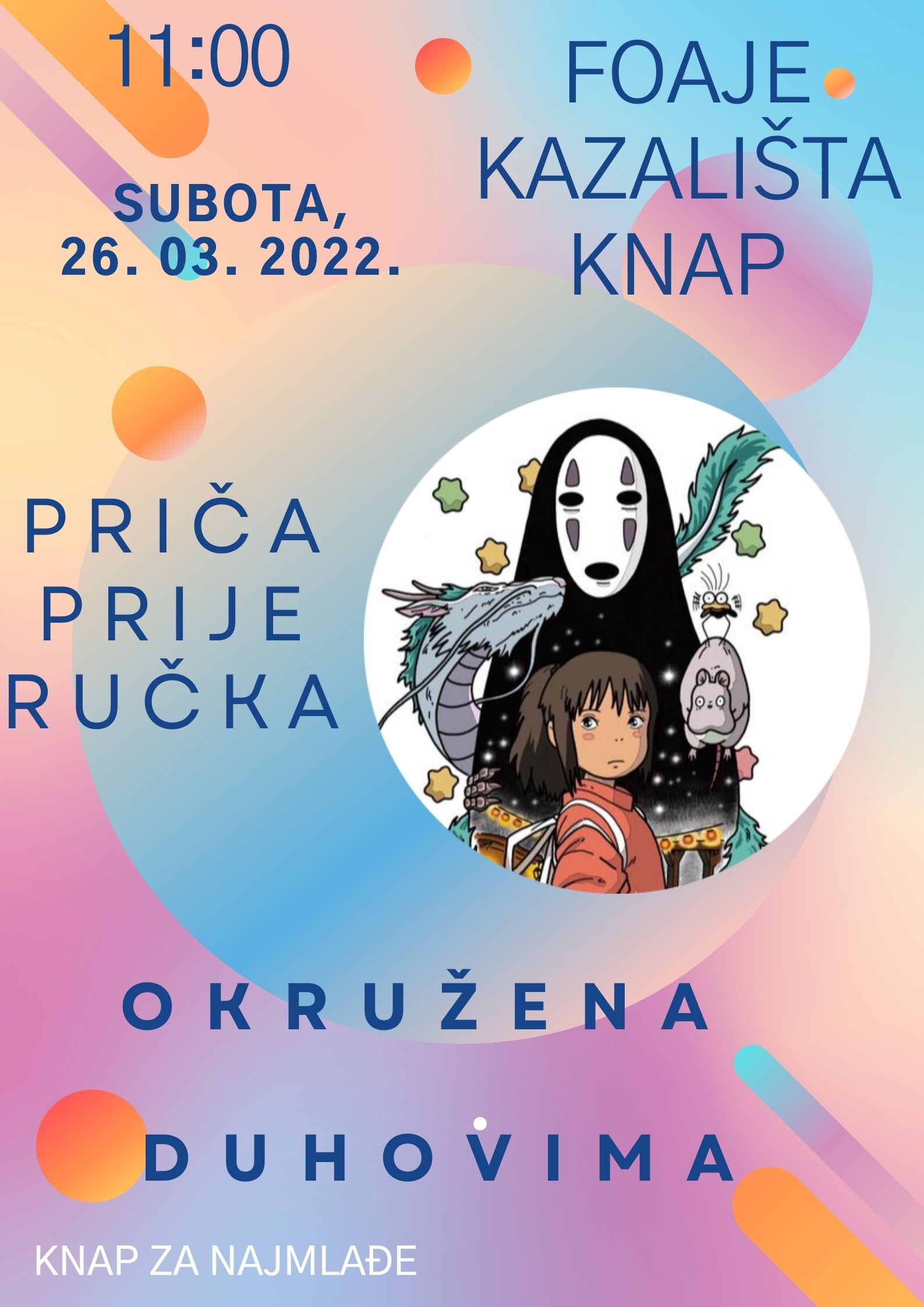 u subotu, 26. ožujka, za koju se nadamo da će biti obilno okupana suncem, te za kraj ciklusa mitologija drevnih naroda, saznat ćemo nešto novo o mitološkim vjerovanjima i tradiciji Japana. Nakon što naučimo u što su to sve vjerovali Japanci, ispričat ćemo priču koja je nastala prema motivima tradicionalnih japanskih vjerovanja Okružena duhovima. Nakon toga crtamo i radimo naša japanska čudovišta te uživamo u dvorištu na predivnom podnevnom suncu. Očekujemo vas u 11 sati u foajeu Kazališta Knap, gdje će naši roditelji, dok se mi kreativno družimo, moći napuniti baterije svojom subotnjom kavicom.