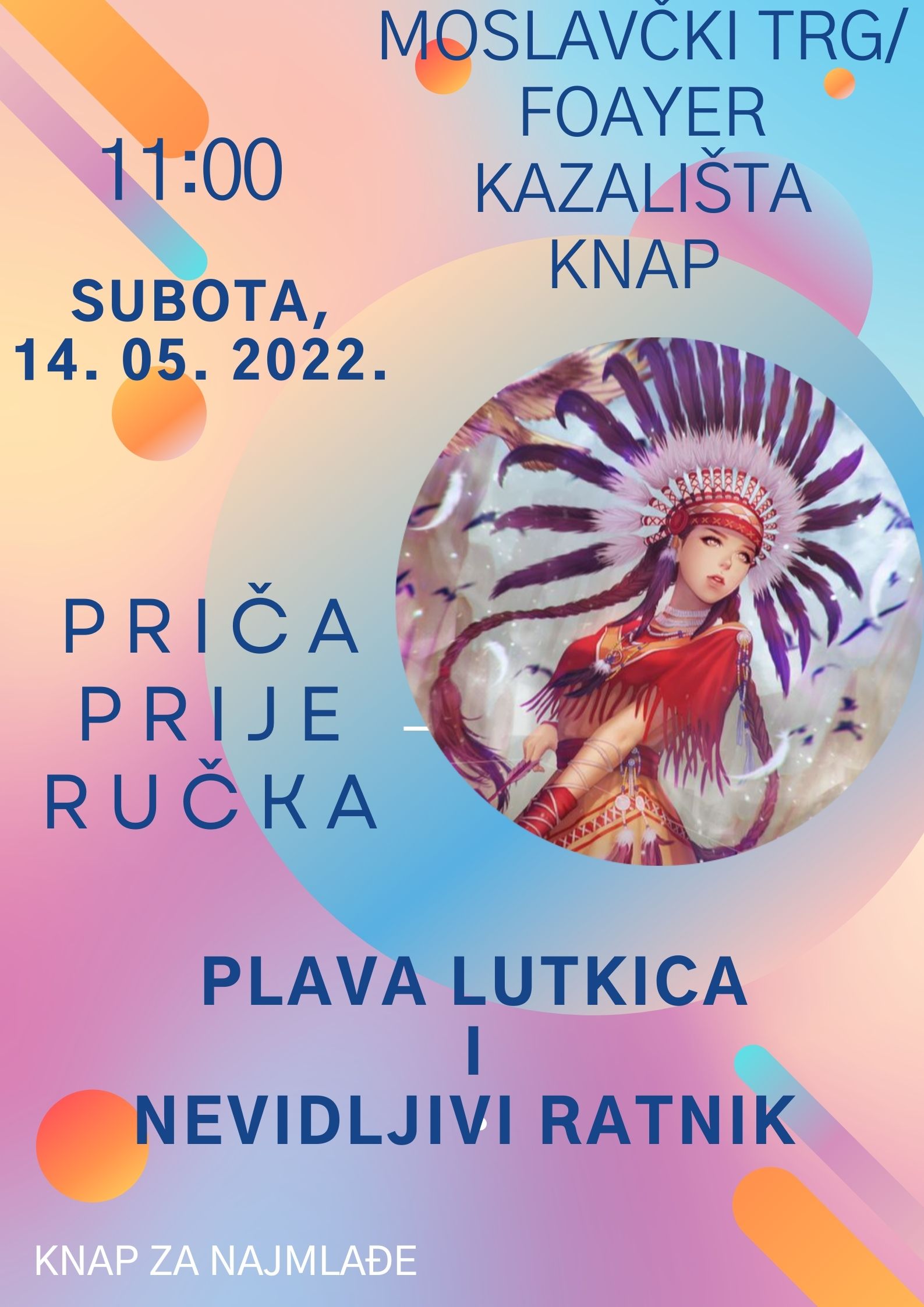 za subotu, 14. svibnja pripremili smo vam novo putovanje pričom. Naime, nakon što smo prošle subote posjetili plemena starih Indiosa , nastavit ćemo kružiti Amerikom, kako bismo saznali više o načinu života i vjerovanjima Indijanaca. Saznat ćemo zašto je važno vratiti prirodi ono što smo uzeli u priči o Plavoj lutkici, a i popričat ćemo malo i o laganju kada saznamo što se dogodilo Nevidljivom ratniku. Nakon toga nas očekuje izrađivanje totema, lovaca na snove, ogrlica i narukvica. Plan je da nam bude turbo zabavno, a vidimo se točno u 11 sati … Sve znate, ako bude sunce bit ćemo u parku na Moslavačkom trgu, a u slučaju muljavog vremena, vidimo se u foajeu Kazališta Knap.