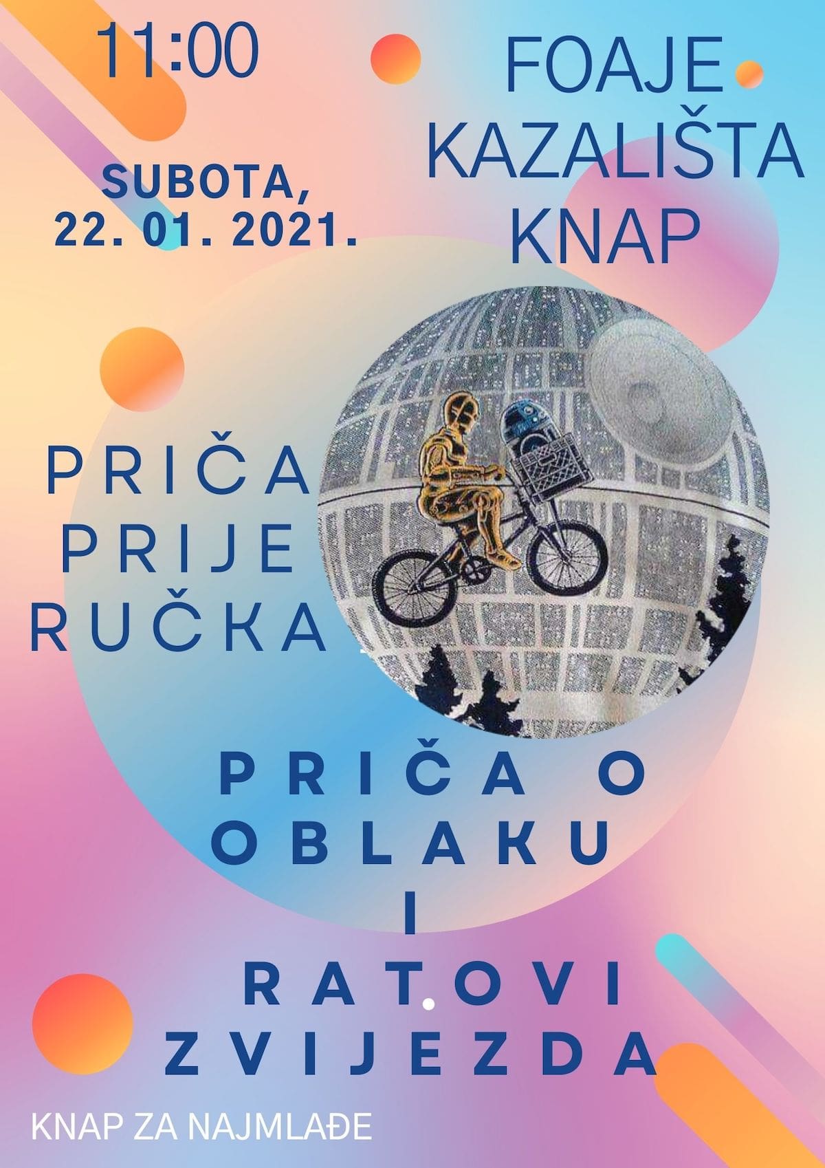 nakon što smo u nekoliko zadnjih subota obradili nekoliko klasičnih priča , u subotu, 22. siječnja očekuje nas nekoliko pravih iznenađenja. Za početak će nas jedna naša pričalica i prijatelj Luka iznenaditi svojom vlastitom predstavom pod nazivom Priča o oblaku, a nakon toga svi ljubitelji sjajnog ciklusa za male i velike Ratovi zvijezda će doći na svoje. Naime, prvo ćemo ispričati čuvenu epsku sagu o Luku Skywalkeru, Princezi Lei i Darth Vaderu, a nakon toga izrađivat ćemo prikladne elemente kako bismo rekreirali neke od najpoznatijih scena iz filma. Stoga molimo sve pričalice koje je ova priča inspirirala da se prikladno obuku, a roditelji će dok se mi zabavljamo moći popiti kavu u našem kafiću. Očekujemo vas u foajeu Kazališta KNAP točno u 11 sati i kao uvijek veselimo se iz petnih žila.