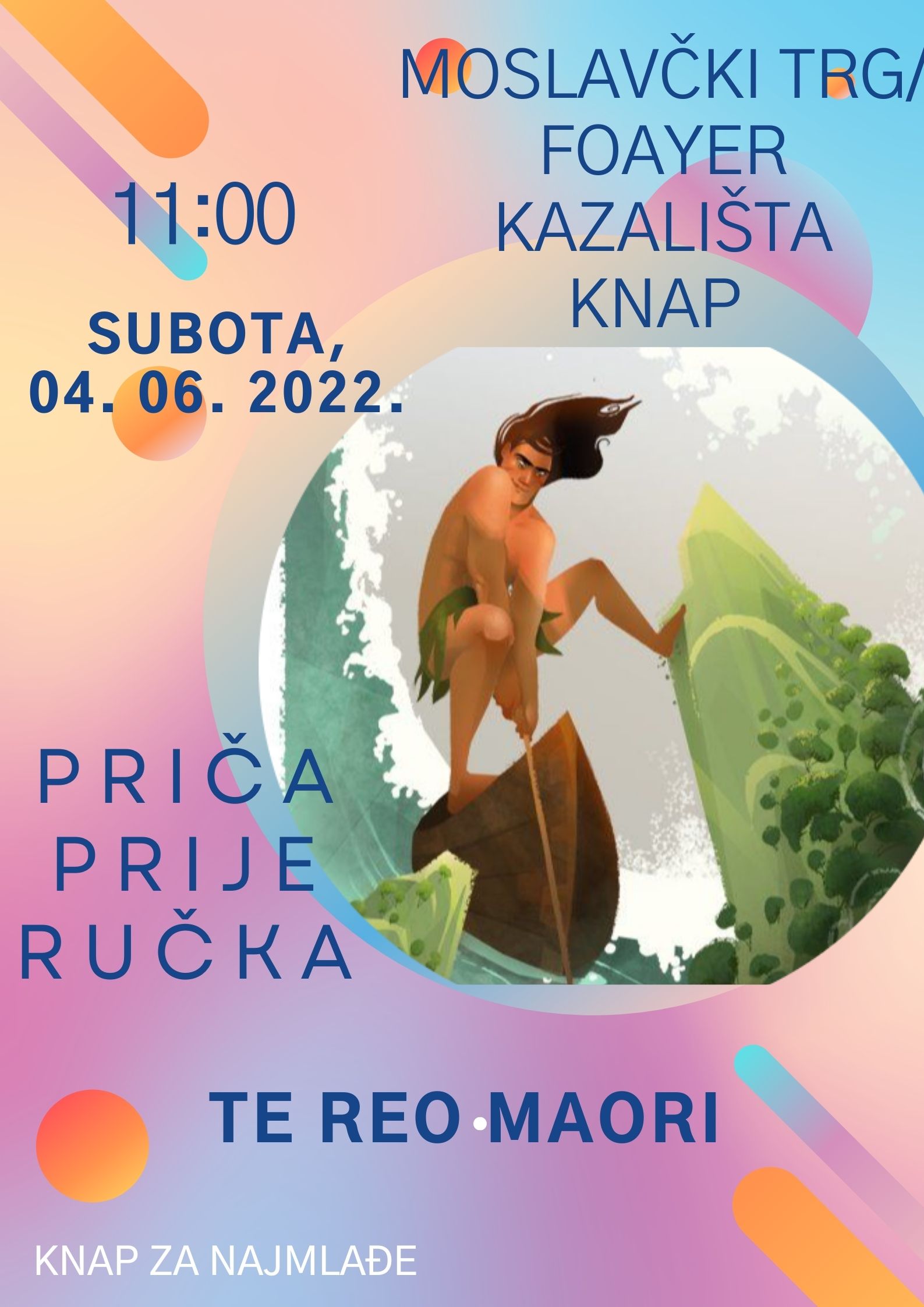 u nadi kako ćemo u subotu, 04. lipnja ipak dozvati veselo i nasmijano sunce, otputovat ćemo s pričama do dalekog Novog Zelanda. Tamo ćemo upoznati domaće Maore i saznati kakve su njihove čudnovate priče. Nakon što sve ispričamo i pregledamo, čeka nas nešto uistinu uzbudljivo. S obzirom da je maorska kultura poznata po svojim tetovažama, u likovnom dijelu ćemo se i mi malo poigrati s istima, a nakon toga slijedi plesanje maorskog tradicionalnog plesa, koji uključuje veselo plaženje jezika. Baš nas zanima čiji će jezik biti najduži? J Vidimo se u 11 sati u našem parku na Moslavačkom trgu, a ako bude oblačno nađemo se u foajeu Kazališta Knap.