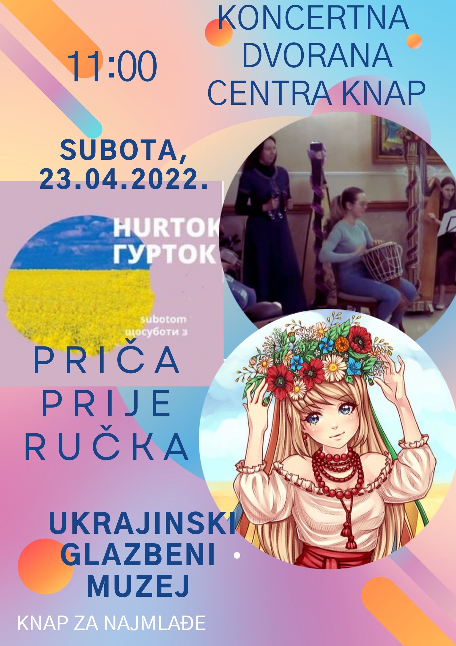 U subotu, 23. travnja u 11 sati Centar Knap se kroz program Priča prije ručka za najmlađe priključuje akciji Hrutok (Krug povjerenja) koju su početkom ruske agresije na Ukrajinu pokrenuli Centar mladih Ribnjak i Kinoteka. Tako ćemo u subotu kroz priče otputovati do ranjene Ukrajine, a u drugom dijelu programa djeci će se predstaviti ukrajinska obitelj Mudrik iz Lavova koja je u ondje imala interaktivni Muzej instrumenata. Osim što će nam ova divna glazbena obitelj glazbom dočarati zvuke svoje domovine, djeca će saznati nešto više o različitim instrumentima koji su u Hrvatsku donijeli upravo iz Lavova te će ih moći i isprobati, kao i zasvirati na njima. Program će se odvijati na ukrajinskom i hrvatskom jeziku- jer program Hurtok upravo ima za cilj nježnu integraciju obitelji koje su napustile Ukrajinu u naše sredine.
