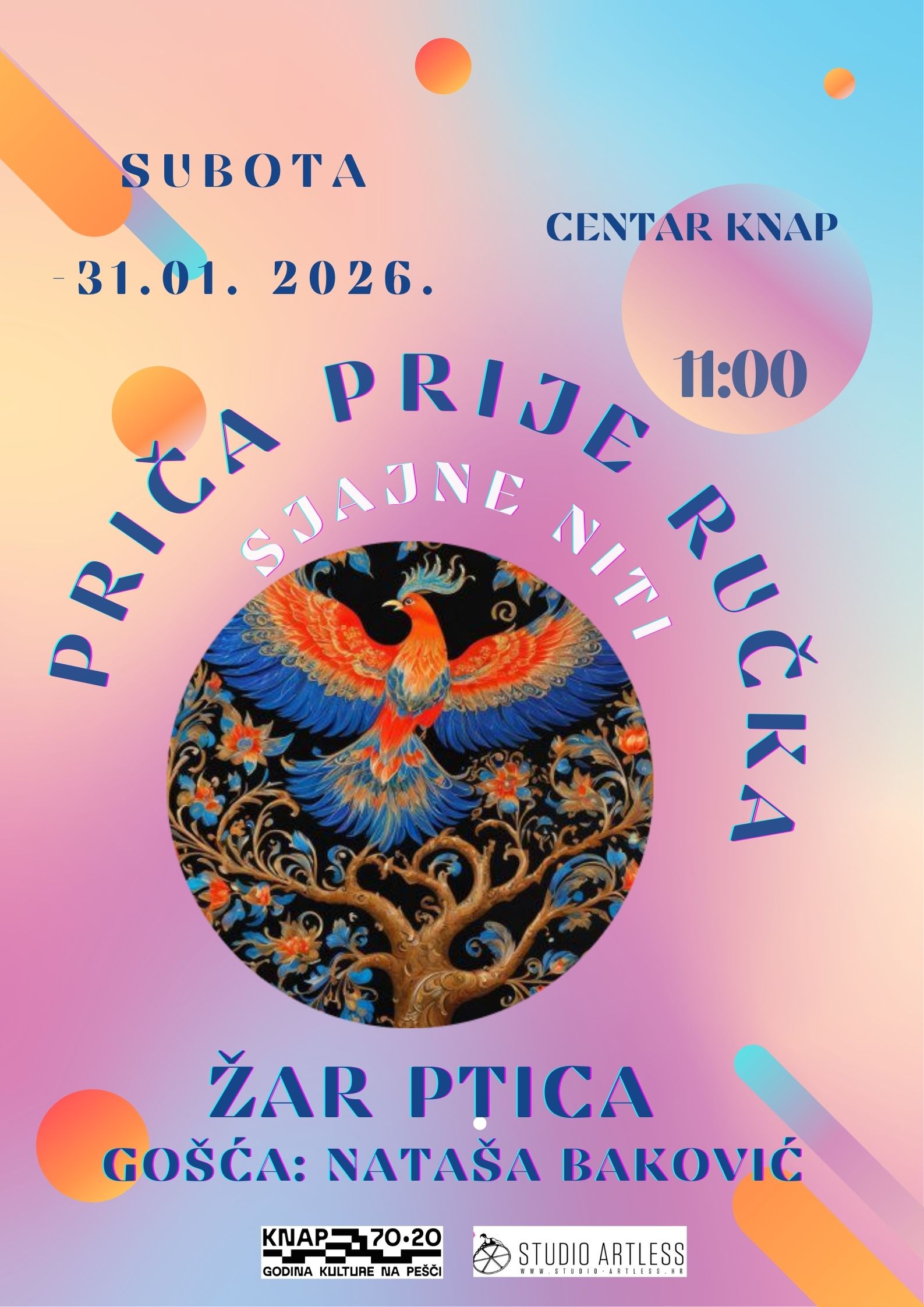 Zato ćemo u ovoj Priči prije ručka pripovijedati najpoznatije slavenske bajke, predvođene omiljenom Žar pticom, koje će nas inspirirati za zajedničko stvaranje. Nakon priče, uz Natašinu pomoć, izrađivat ćemo vlastite kolaže nadahnute ovom bezvremenskom bajkom.